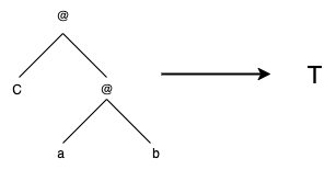 This portrays this computer program way too intelligent. We should formalise what the search space looks like over rewrite rules, or, in our case, combinatory logic identities. Really, they are just trees. Here is the first rewrite rule pictorially: